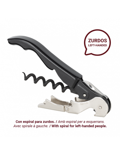 LEFT-HANDED TWO-STROKE CORKSCREW: Pulltap's Classic 500 Professional Waiter's Corkscrew, a double hinged lever corkscrew with retractable hinged blade, now with a spiral specially designed for left-handed people.