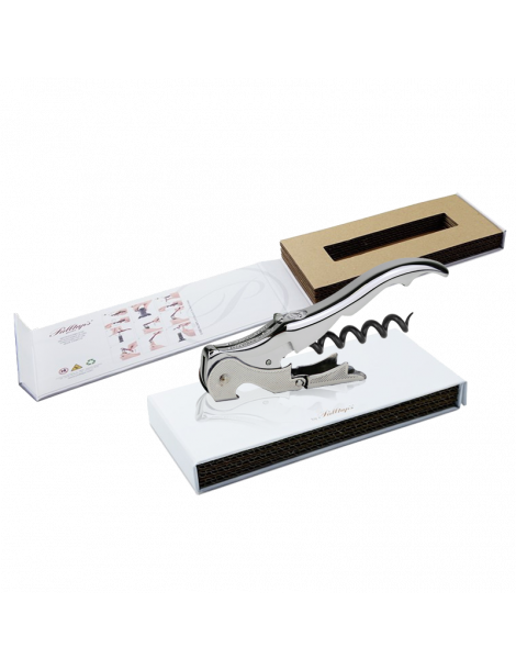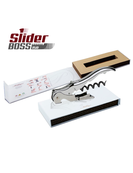 LOTE PROFESSIONAL WHITE 150: El pack incluye un sacacorchos premium de dos tiempos Slider Boss 150 presentado en una elegante caja de cartón blanco con cierre imantado.