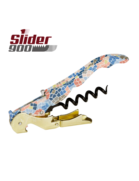 SACACORCHOS DE DOS TIEMPOS TRENCADÍS 900: Sacacorchos Slider 900 sublimado con diseño Trencadís, inspirado en Barcelona y Antoni Gaudí. Es un sacacorchos con diseño especial trencadís, doble palanca articulada, y hoja deslizante con retorno automático.