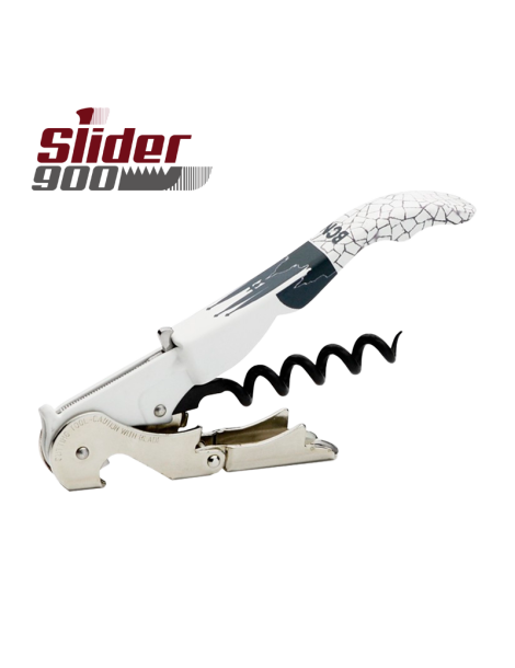 El modelo Slider 900 es un sacacorchos de dos tiempos pensado para uso profesional, para agilizar el proceso de descorche del vino, ya que permite a camareros y sumilleres accionar la cuchilla para cortar el aluminio protector de las botellas de vino con una sola mano, simplemente deslizando la cuchilla con el dedo pulgar.